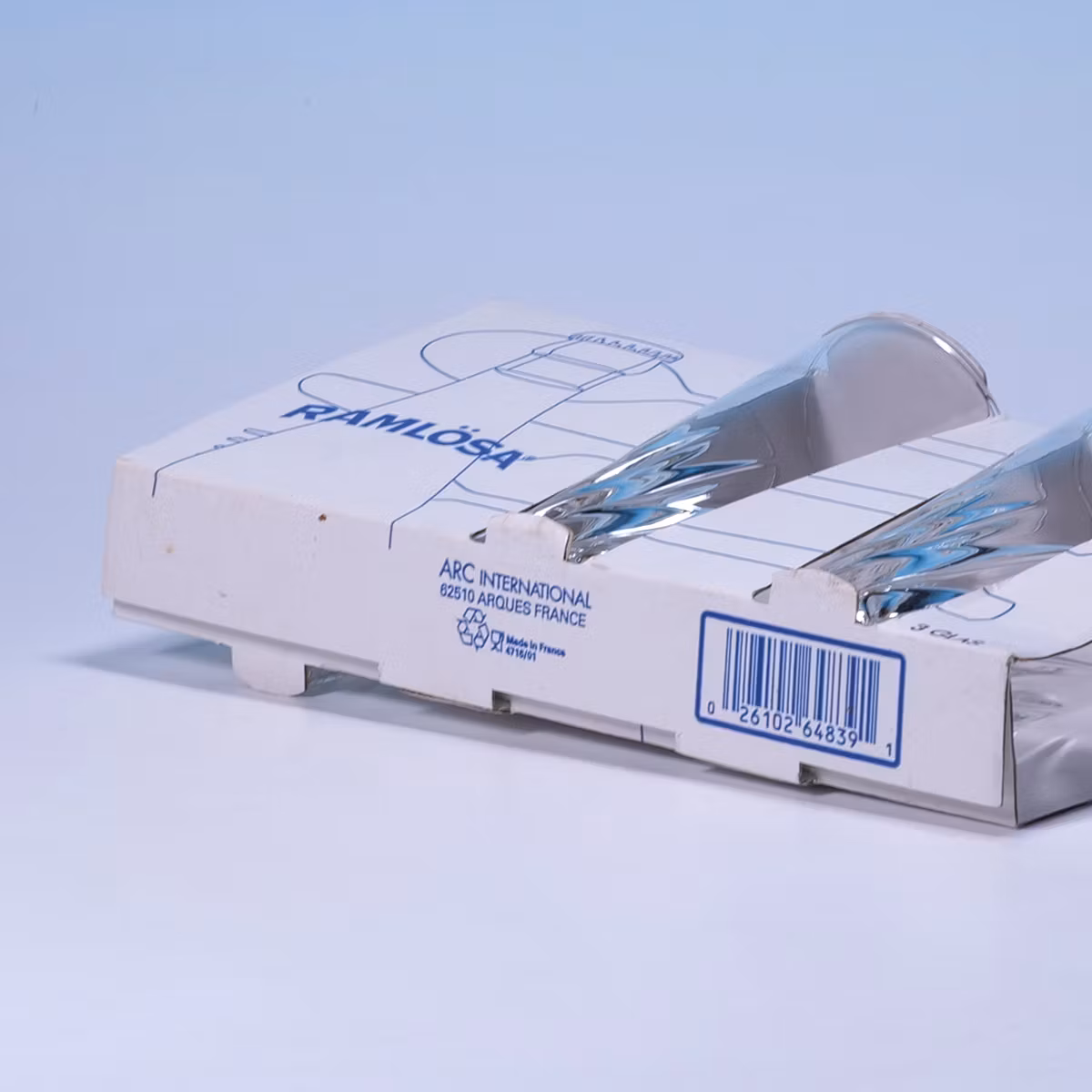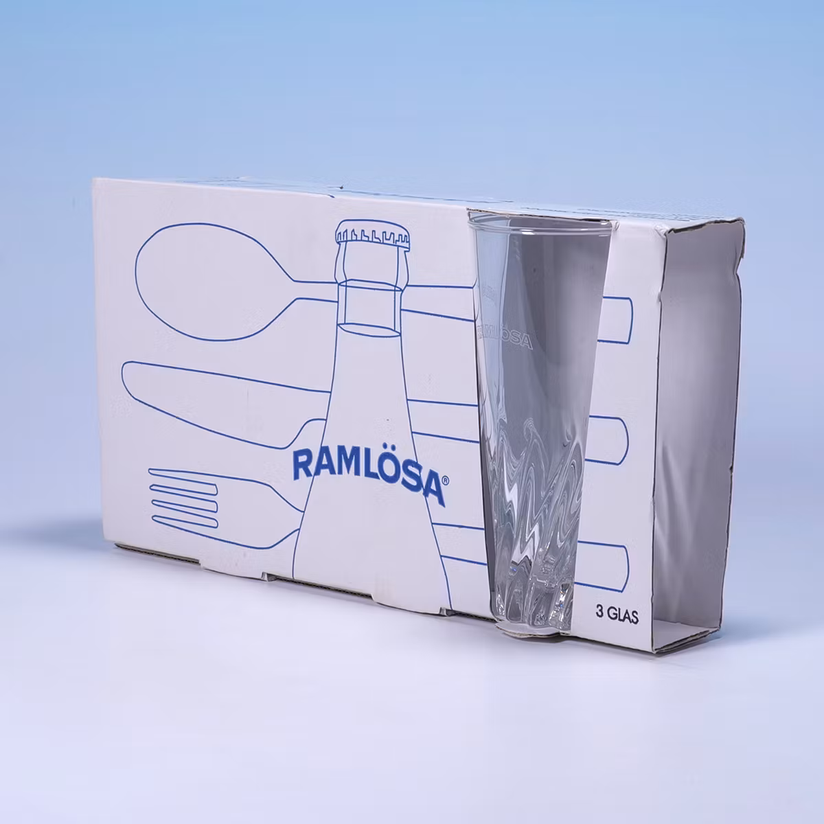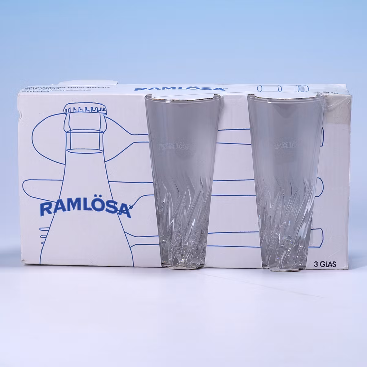 Tre glas, noll ångest. 💧🥂 Oanvända kalasglas från Ramlösa, made in France, med grafik som skriker IKEA-katalog och Blåvitt-vibbar. Ligger fortfarande snyggt i sin förpackning och väntar på fest som aldrig blev av. Sjukt fina.