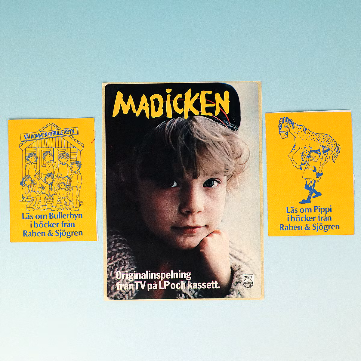 Tre klistermärken laddade med svensk barndom på max. 🌼📚 Två från Rabén & Sjögren som marknadsför Bullerbyn och Pippi, plus ett som pushar Madickens musik på LP och kassett vilket i sig är helt underbart. Det är trygghet, bus och kulturhistoria i pappersform. Svenskt, snällt och jävligt fint.
