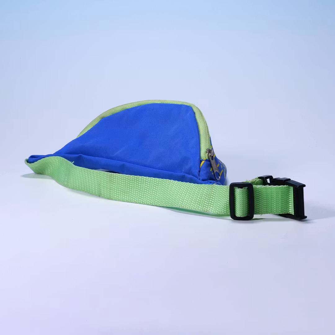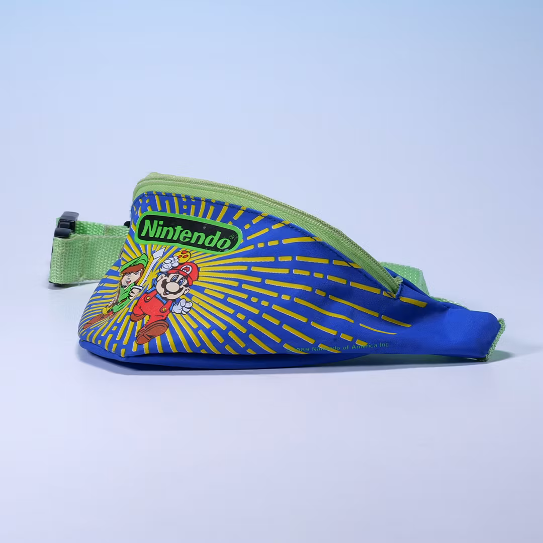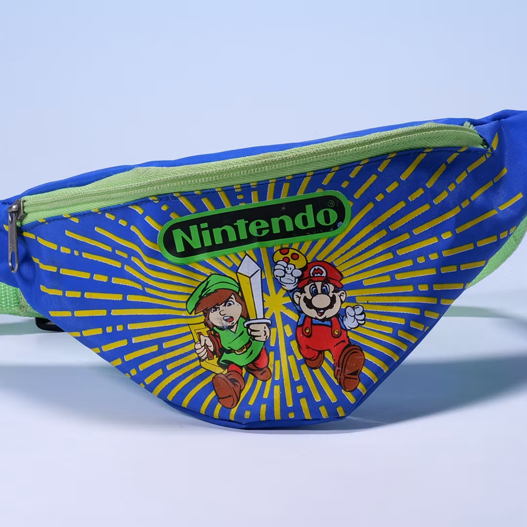 Sjukt snygg magväska i blått med neongrön zip och rem. På framsidan ser vi Link från The Legend of Zelda och Mario från Super Mario som hoppar fram ur gula laserstrålar. Den här väskan från 90-talet är både cool och praktisk, perfekt för att bära med sig de viktigaste prylarna.