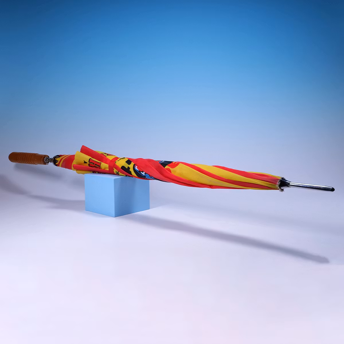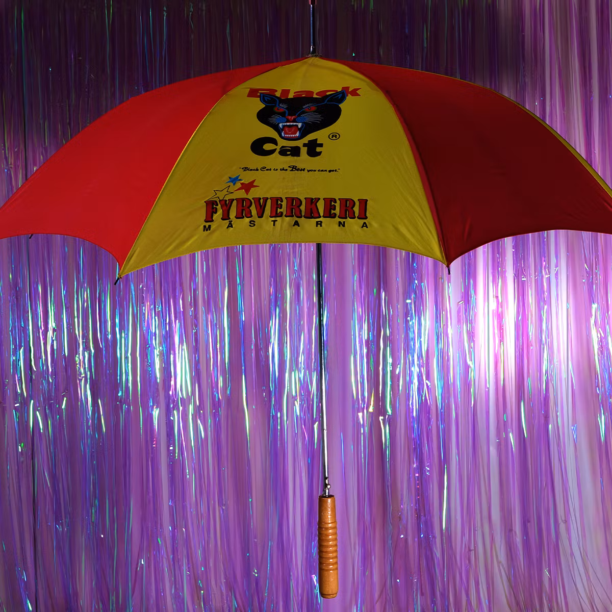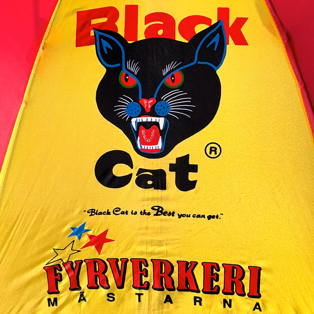 Det här paraplyet ser ut som att det borde explodera av stil. 🎆🐈 Rödgul färgsmäll med den episka Black Cat-loggan, direkt från svensk fyrverkerireklam när den var som mest kompromisslös. Otroligt fint skick för sin ålder och så jävla snyggt att regnet känns sekundärt. Ett paraply med attityd och krut.