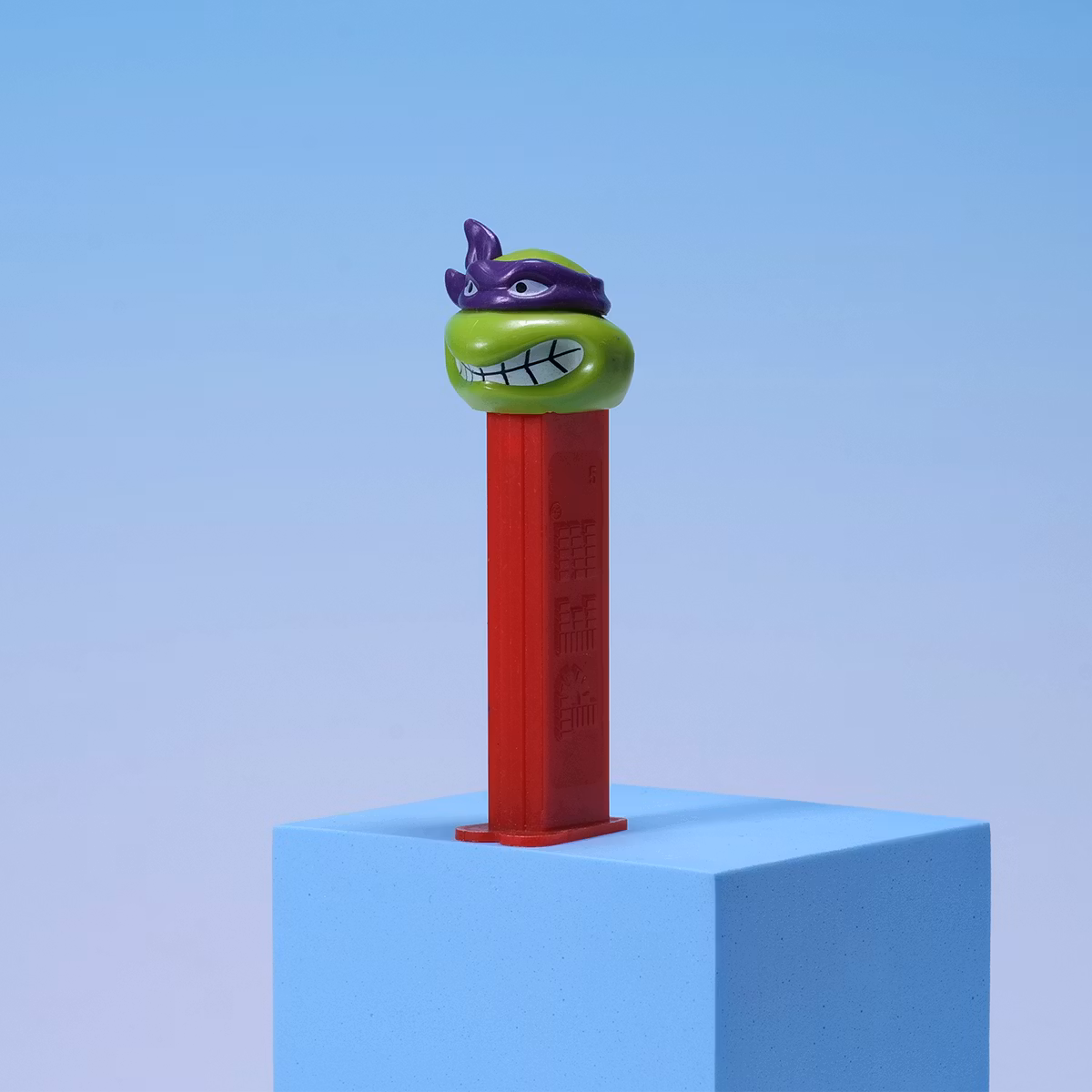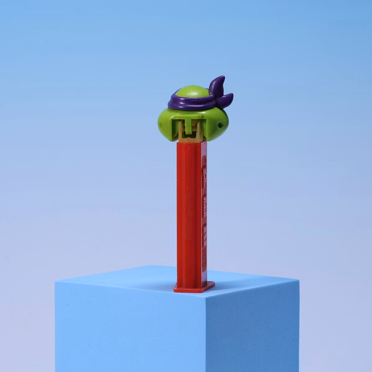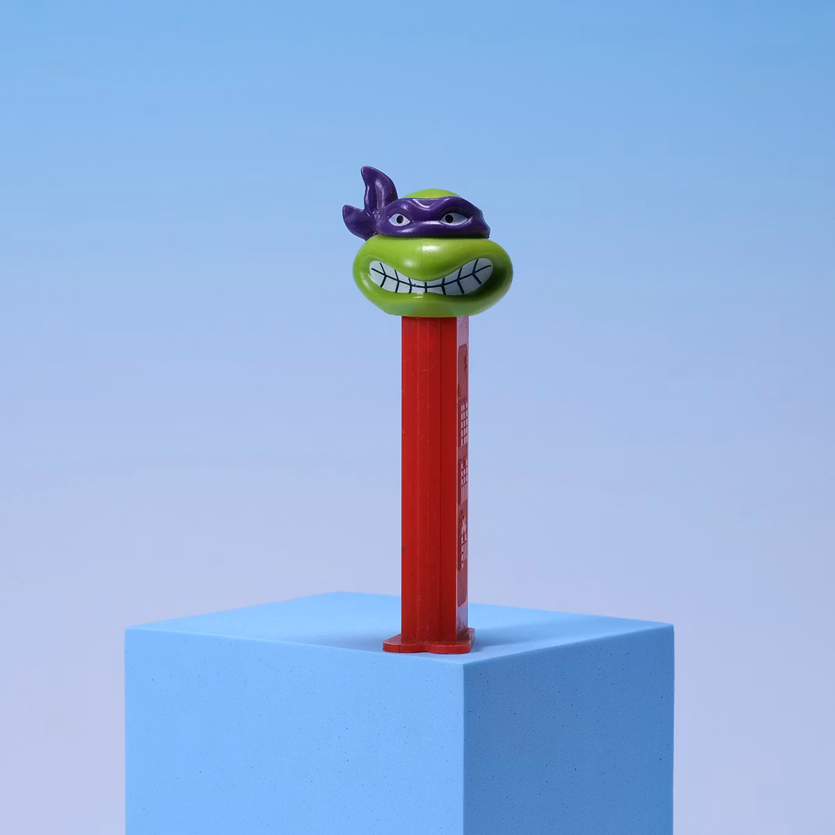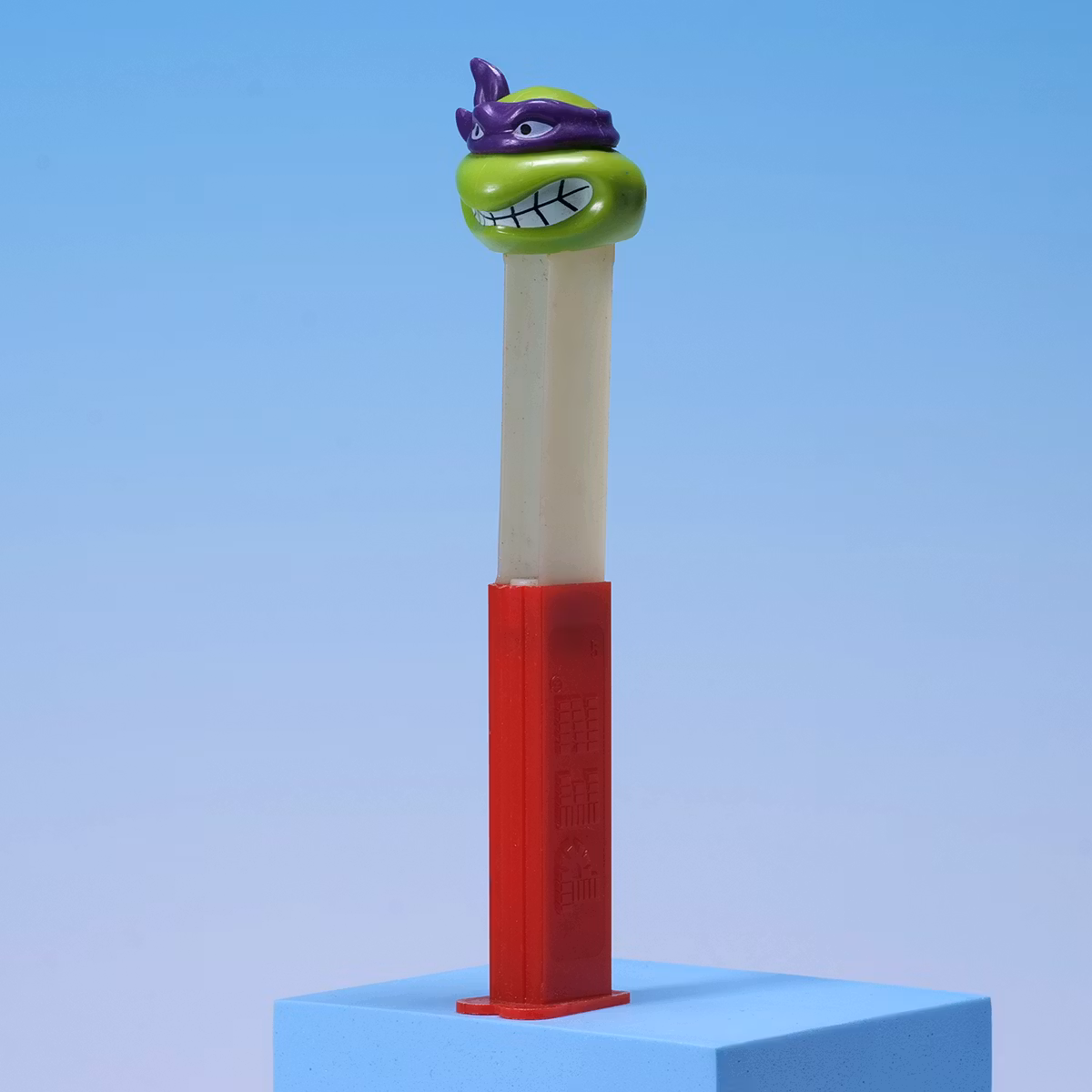 En arg Donatello på röda ben. Punkt. 🍬🐢 PEZ-dispenser som kombinerar godis och aggression på bästa möjliga sätt. Red stem-varianten är extra snygg och ser ut som den dömer dig när du öppnar den. Smått, kul och jävligt displayvänligt. Den är diskad, men skulle inte rekommendera att du har godis du ska äta i den. Lite gulnad plast på den vita delen.