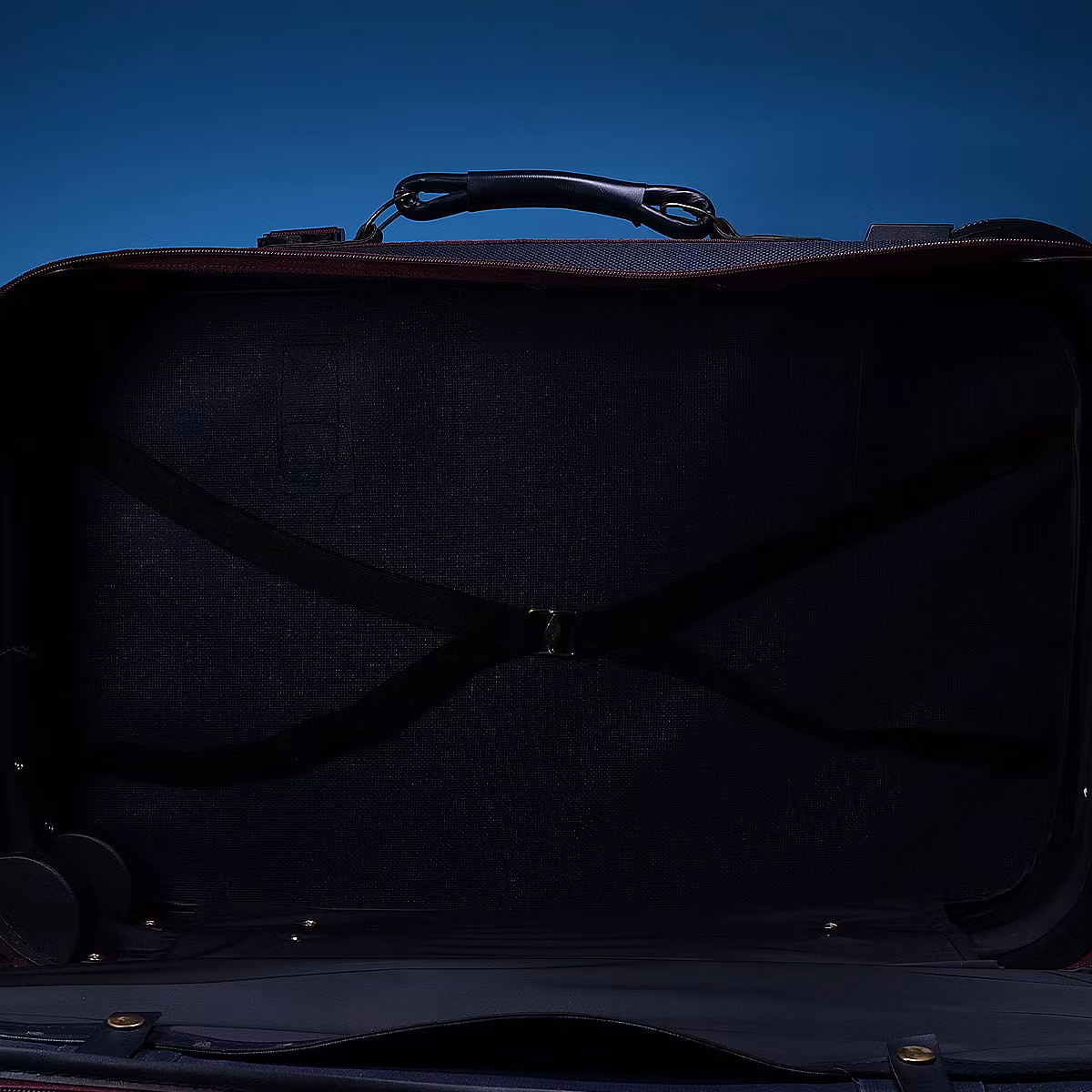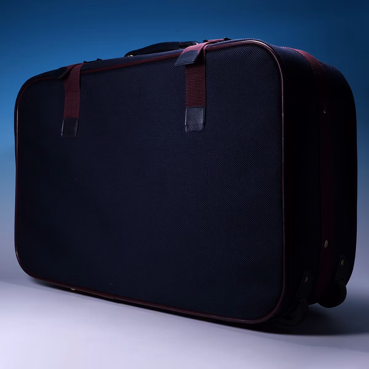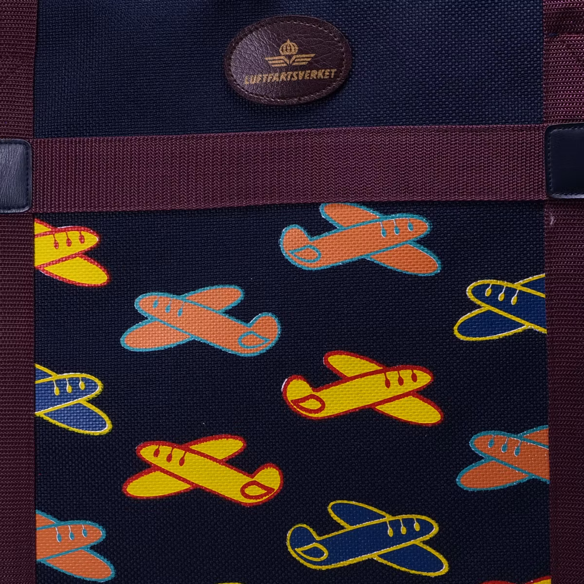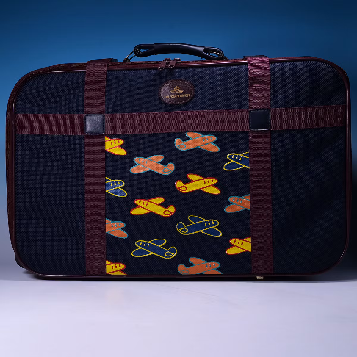 Det är ett jävla flygplansliv! 🎒✈️ Stor trunk med hjul, handtag och en design som flirtar hårt med LV men med svensk myndighets-energi. Läderdetaljer och monokroma flygplansikoner gör den helt brutal. Ser knappt använd ut, vilket är helt sjukt.