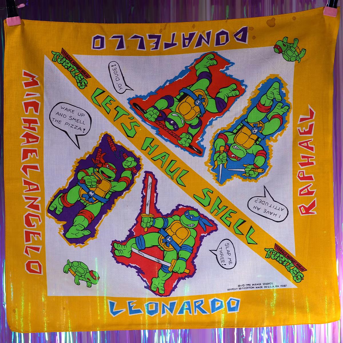 En scarf som skriker COWABUNGA. đąđ§Ł 55x55 cm av ren vintage-energi med sköldpaddorna redo att slĂ„ ihop sina skal. Lite flĂ€ckig i kanterna men inget en snĂ€ll handtvĂ€tt inte kan fixa. Sjukt cool accessoar som funkar lika bra runt halsen som pĂ„ vĂ€ggen. Eller rĂ„na en bank med!
