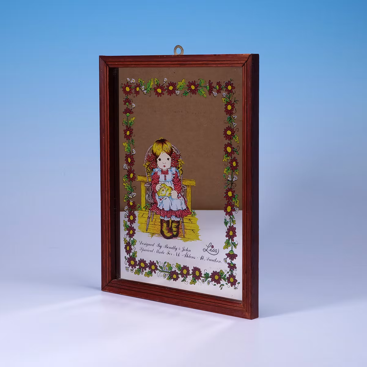 En spegel med känslor. 🪞🌸 Tryck av en liten flicka, blommor och varuhusromantik i ett. Fint skick och en design som känns både trygg och lite märklig på samma gång. Perfekt för den som vill ha något som inte är helt… normalt. Gjord för NK och Åhléns!